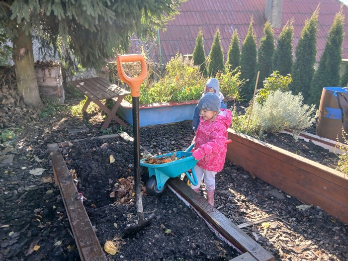 Na školní zahradě se malí zahradníci s nadšením pustili do podzimních prací. Společně jsme hrabali listí, ryli záhony, abychom zahradu připravili na zimu.